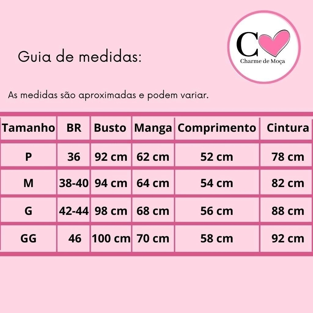 GG (46) || Busto: 100cm || Manga: 70cm || Comprimento: 58cm || Cintura: 92cm